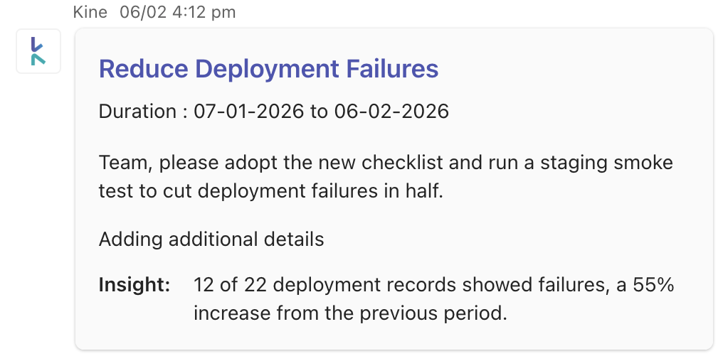 AI Nudges are intelligent, metric-aware coaching messages generated inside the KineGPT Engineering Dashboard. Instead of simply showing charts, AI Nudges analyze engineering metrics and recommend clear next-best actions.